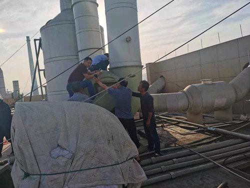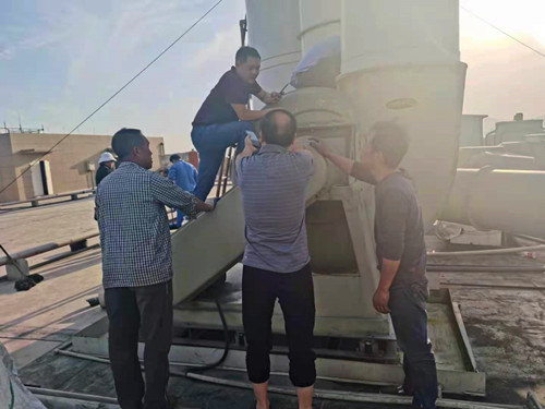 在這里給廣大使用我們風機的客戶一個提示,玻璃鋼離心風機如果在使用過程中出現異常的情況需要寄了停機檢查,如噪音、震動、異響等。這樣做可以盡快檢查出風機的故障原因,還可以避免發生安全事故。如下面是玻璃鋼離心風機的維修現場圖,圖中是本公司的工作人員正在更換風機軸承箱。